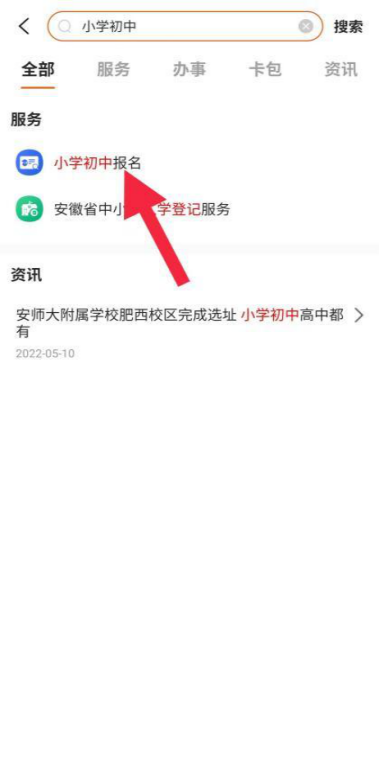 皖事通访问路径:登录—位置切换“合肥市”—搜索框搜索“小学初中报名”