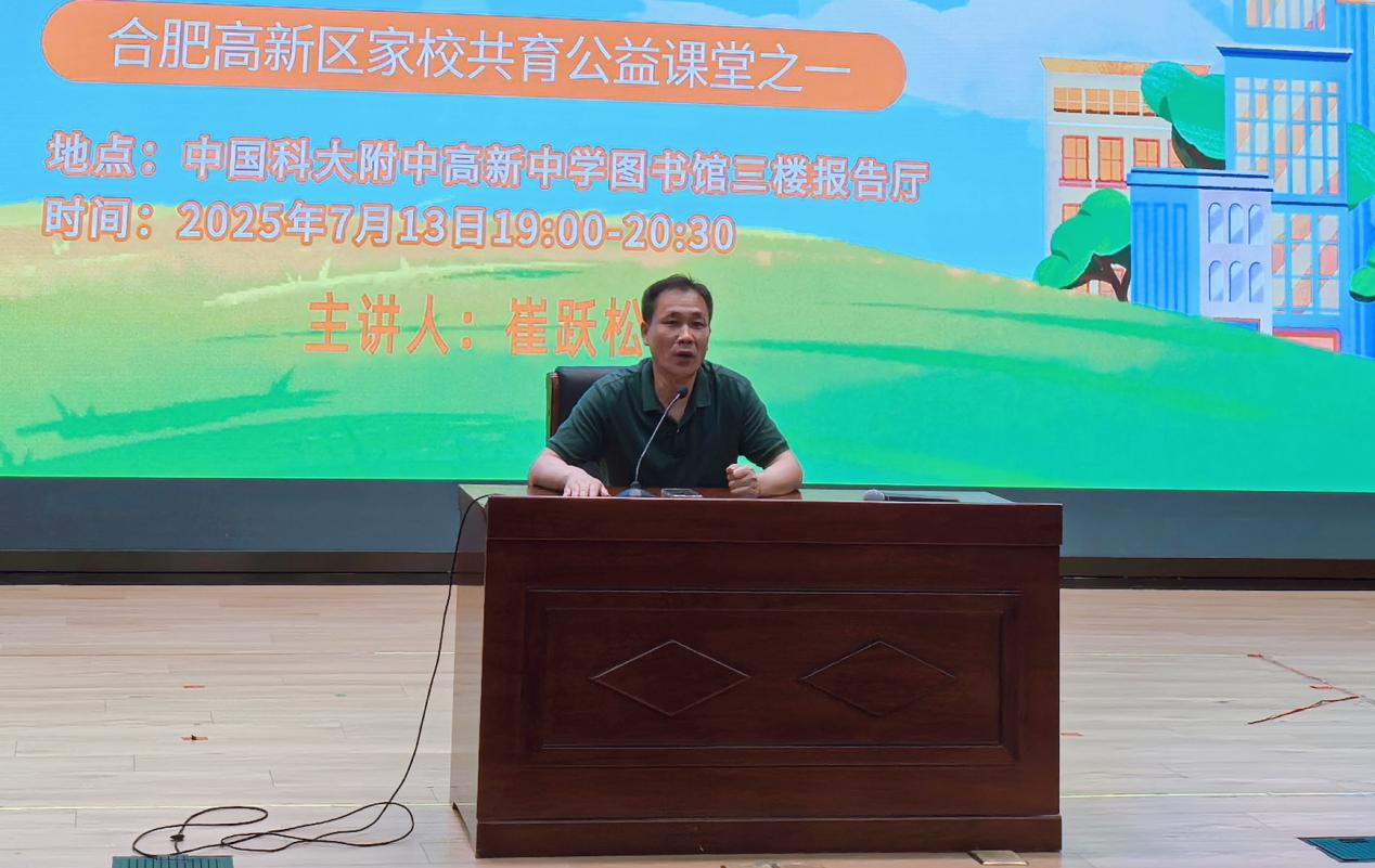 夏夜微风轻拂校园,灯火辉煌汇聚智慧。7月13日晚7:00,合肥市高新区家校共育公益课堂讲座《阳光之家,育青春少年》在中国科大附中高新中学图书馆三楼报告厅隆重举行。此次讲座面向全区家长,线上线下同步直播,现场吸引了近300名我校家长热情参与。