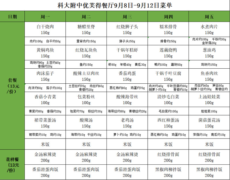 中国科大附中高新中学2025-2026学年第一学期第二周菜谱(9月8日至9月12日)