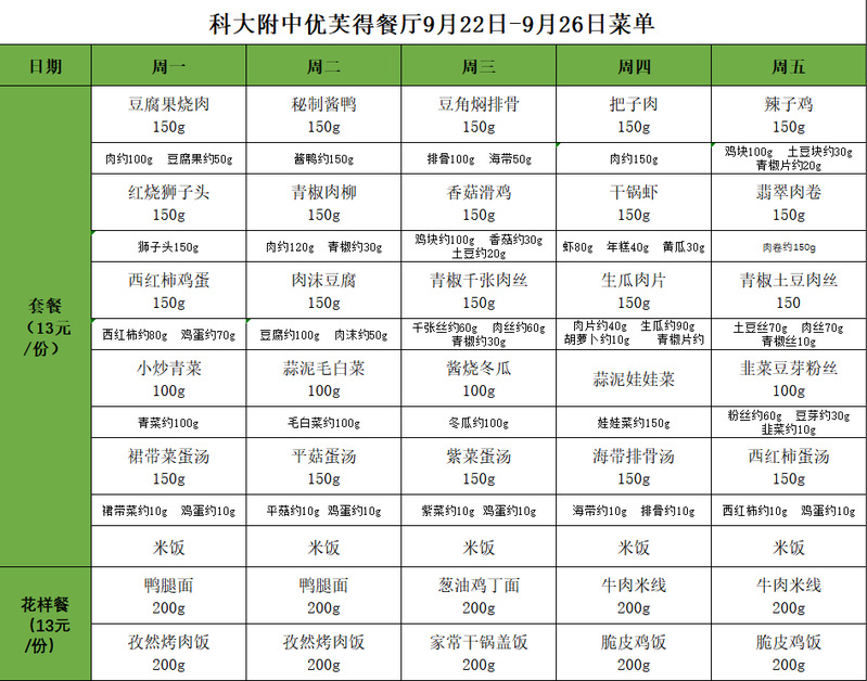 中国科大附中高新中学2025-2026学年第一学期第四周菜谱(9月22日至9月26日)