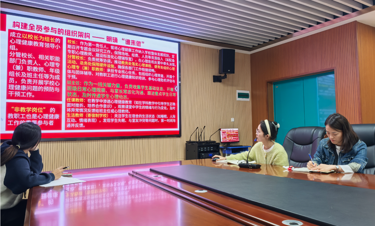 培训中,我校心理健康教师王丽首先围绕《中小学心理健康问题预防与干预工作实施导则(试行)》,深入解读了其制定背景与现实意义,强调了当前加强中小学心理健康教育工作的紧迫性与重要性。随后,培训聚焦“落实《导则》要求的实践路径”,从学校工作体系构建、开学前准备、学期常规工作、关键节点专项安排以及重点学生休复学流程五个方面,系统梳理并提供了具有“可操作、可落地”特点的班主任工作指引。