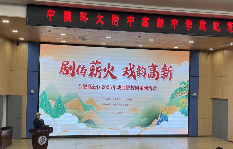 10月29日下午,合肥高新区“戏曲进校园”系列活动在中国科大附中高新中学三楼报告厅隆重举行,七年级部分学生参加了本次活动。活动以“剧传薪火 戏韵高新”为主题,特邀国家三级演员章妍担任主讲,她为同学们带来一场题为《感受国粹之韵》的京剧艺术讲座,传统戏曲的种子在青春的土壤中生根发芽。