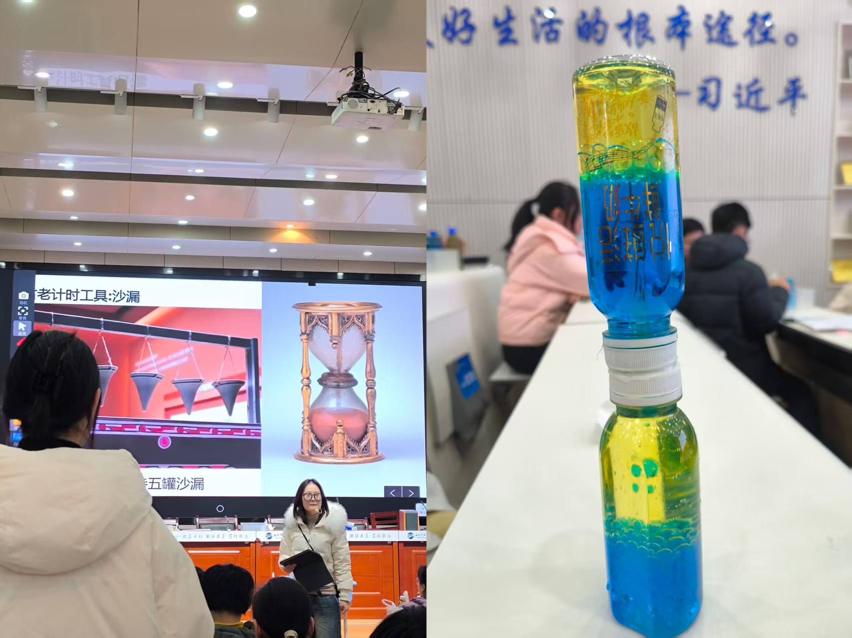 活动首先呈现了一节生动的跨学科实践课例——《制作水油沙漏》。本节课巧妙融合物理学科的密度、浮力知识与劳动实践,引导学生通过设计、选材、调配与组装,在动手协作中深化对科学原理的理解与应用。课堂生动展现了“做中学、学中悟”的理念,为观摩教师提供了跨学科教学落地实施的直观范例。