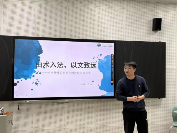 创新实验学校胡文建组长以“由术入法,由文致远”为主题,系统分享了中学物理论文写作的实践心得。他从选题聚焦、素材积累、结构搭建到学术表达进行了全面讲解,强调教学实践与理论反思的相互促进。此次分享进一步拓展了工作室活动的内涵,呼应了“精进学术表达”的活动主题。