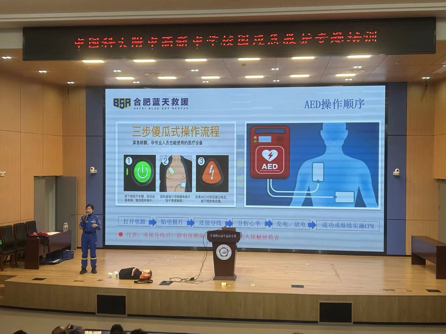 为深入落实市教育局关于校园安全工作的部署要求,切实提升全体教职工的应急救护能力,筑牢校园安全防护网。4月15日下午,中国科大附中高新中学在学校图书馆三楼报告厅组织开展了校园应急救护技能专题培训。本次培训特邀合肥蓝天救援队资深讲师吕文健授课,全体教师参会学习,20名体育教师在培训后参加了专项考核。
